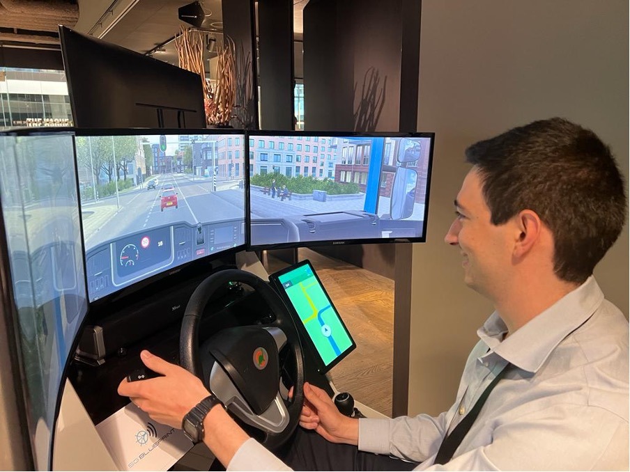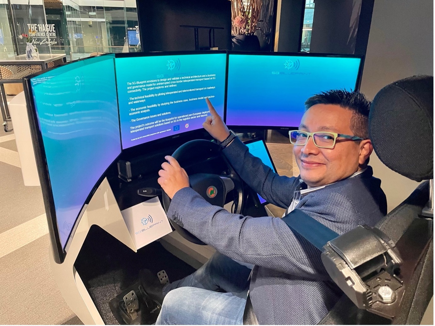 During the breaks, the participants had an opportunity to test their driving skills: several have tried to teleoperate a virtual truck thanks to the 5G-Blueprint simulator.