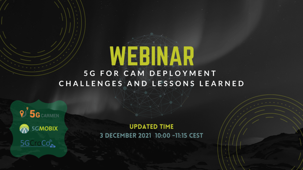 In this webinar on December 3 (updated date), 5G-MOBIX, 5G-CroCo and 5G-CARMEN partners will bring forward their experience on challenges faced and lessons learned during deployment and integration of 5G for CAM use cases in cross-border scenarios, namely 5G network connectivity, vehicles/OBUs, and software tools.