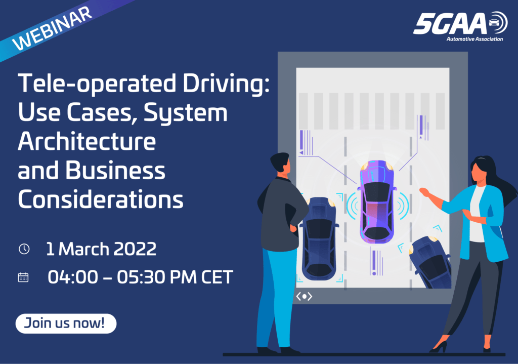 5GAA invites you to a webinar on the developed 5GAA Use Cases, System Architecture and Business Considerations of Tele-operated Driving. The evolution of driving automation technology is gradually reducing our dependence on human drivers. Tele-operated Driving (ToD) technology separates drivers or driving automation systems from the physical vehicle, effectively operating it from a remote location. ToD services address the corner cases associated with automated vehicle operations, which the automated driving systems cannot handle, or remotely perform specific driving tasks of non-automated vehicles. This webinar will present to you use cases, technical and business framework, as well as a visionary roadmap for ToD services based on the published 5GAA Technical Reports and White Paper.